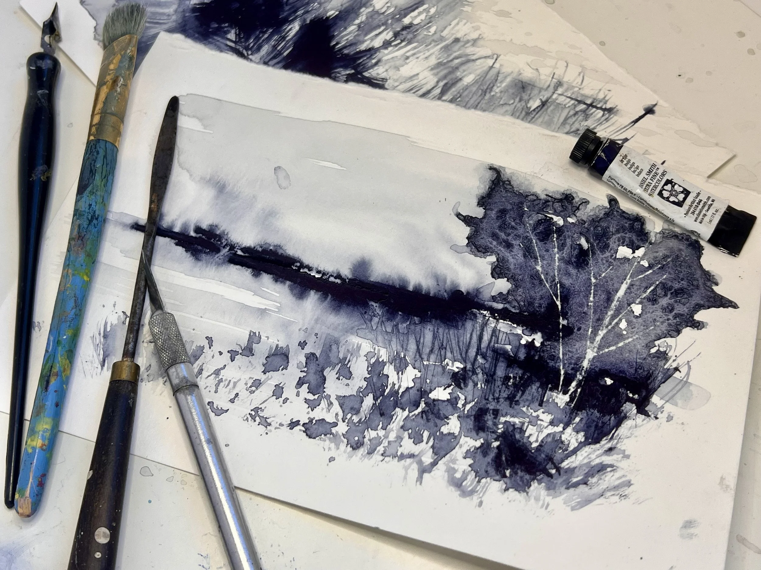 Join Erica Qualey for a relaxed, playful watercolor workshop focused on small-scale, monochromatic abstract landscapes. We’ll explore the beauty of a limited palette while experimenting with saturation and the wet-into-wet process. By embracing how paint and water interact, we will push those boundaries to create unexpected and surprising results. We’ll also experiment with alternative ways of applying paint beyond the brush to create interesting marks, textures, and effects. Expect curiosity, exploration, and a low-pressure space to create!